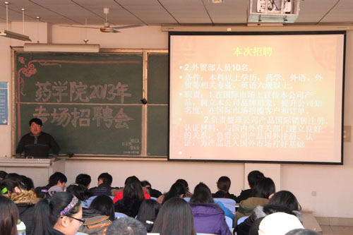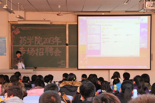 为切实做好2014届毕业生就业工作,促进学校、毕业生与用人单位面对面的交流和沟通,给毕业生提供更多就业机会,药学院于 12月12日 在日照校区C312教室举办了2014届毕业生冬季专场招聘会。北京赛德盛医药科技有限公司,正大天晴药业集团股份有限公司、江苏新晨医药有限公司、瑞阳制药有限公司、辰欣药业股份有限公司等多家企业应邀参加,共提供就业岗位270余个,药学院、管理学院、生物科学系等400余名学生参加了本次招聘会。