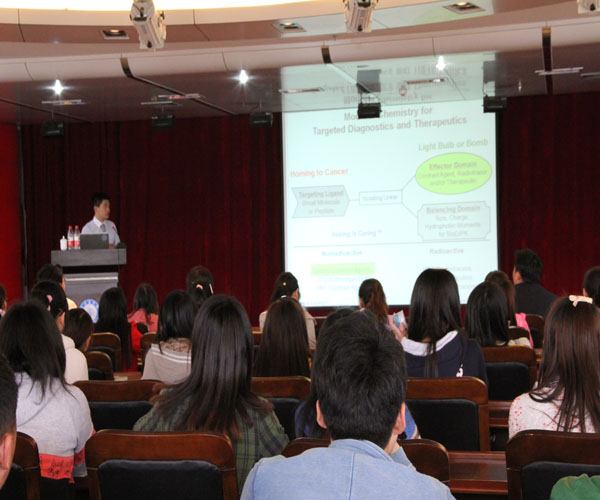 4月23日下午,包凯在日照校区综合楼二楼学术报告厅作了题为《近红外骨靶向及PSMA 靶向荧光剂的研究进展》的学术讲座。报告分为医学成像领域的常规技术手段和研究策略、基于组合化学方法中one bead one chemistry技术和前列腺癌PSMA靶点的小分子抑制剂的研究以及具有PSMA靶向的荧光试剂的研究三个部分,包凯结合他的研究课题详细介绍了其课题组自主开发的自动化机械合成装置——快速自动化完成小分子化合物库的构建、高通量体外活性筛选平台, MR、CT、PET等技术与近红外荧光成像技术的比较及后者的评价标准,以及目前关于PSMA蛋白及相关小分子抑制剂的研究概况。包凯博士的讲座获得了在座师生的一致好评。药学院院长王慧云、副院长王其宝及师生代表230余人参加了讲座。