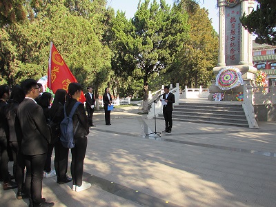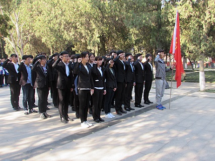 4月2日上午8点全体成员在英雄纪念碑前列队集合,大家齐唱国歌后,学生干部代表诵读悼念词,并号召大家学习革命先烈的大无畏精神,努力提高个人素质,学知识、长才能、成栋梁。随后学生代表敬献花,全体人员肃立向英雄纪念碑鞠躬默哀,默哀完毕,由党员代表带领全体人员宣誓。仪式结束后,同学们对陵园进行了卫生清扫,并参观了日照暴动纪念馆。