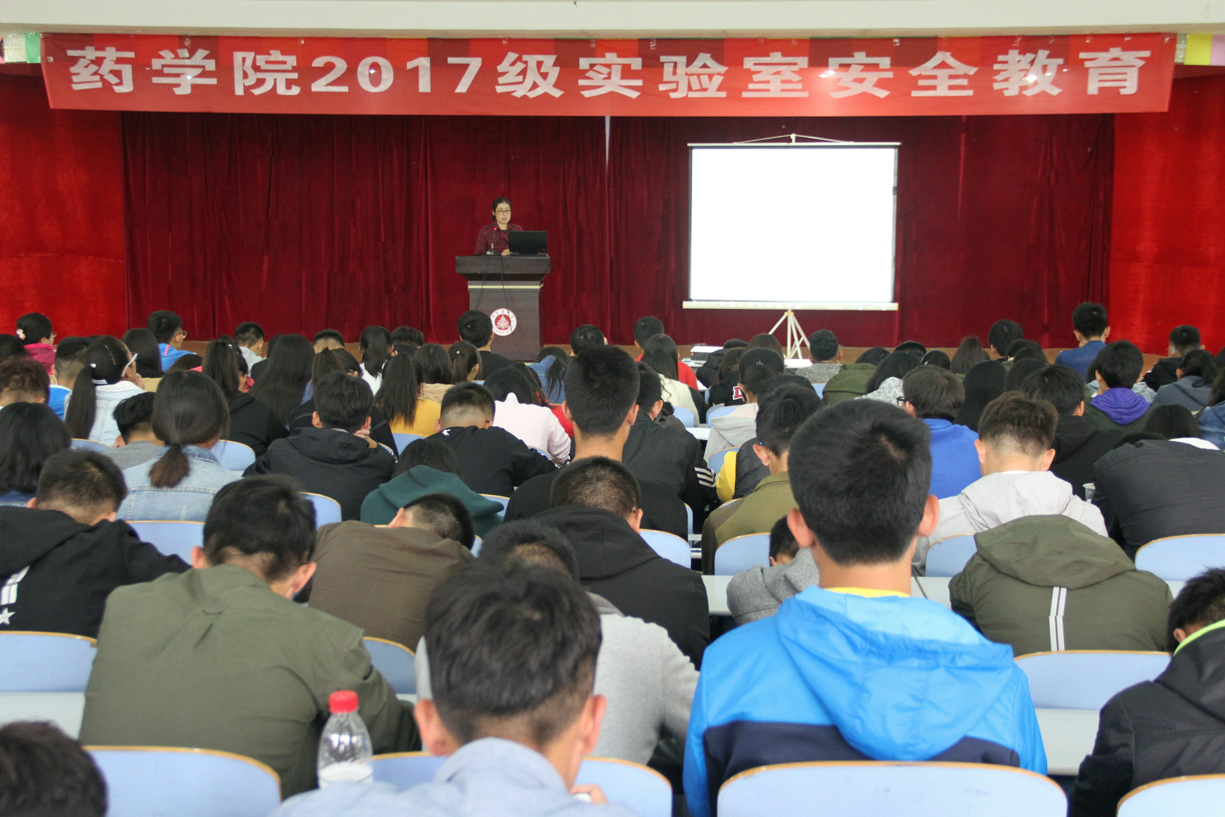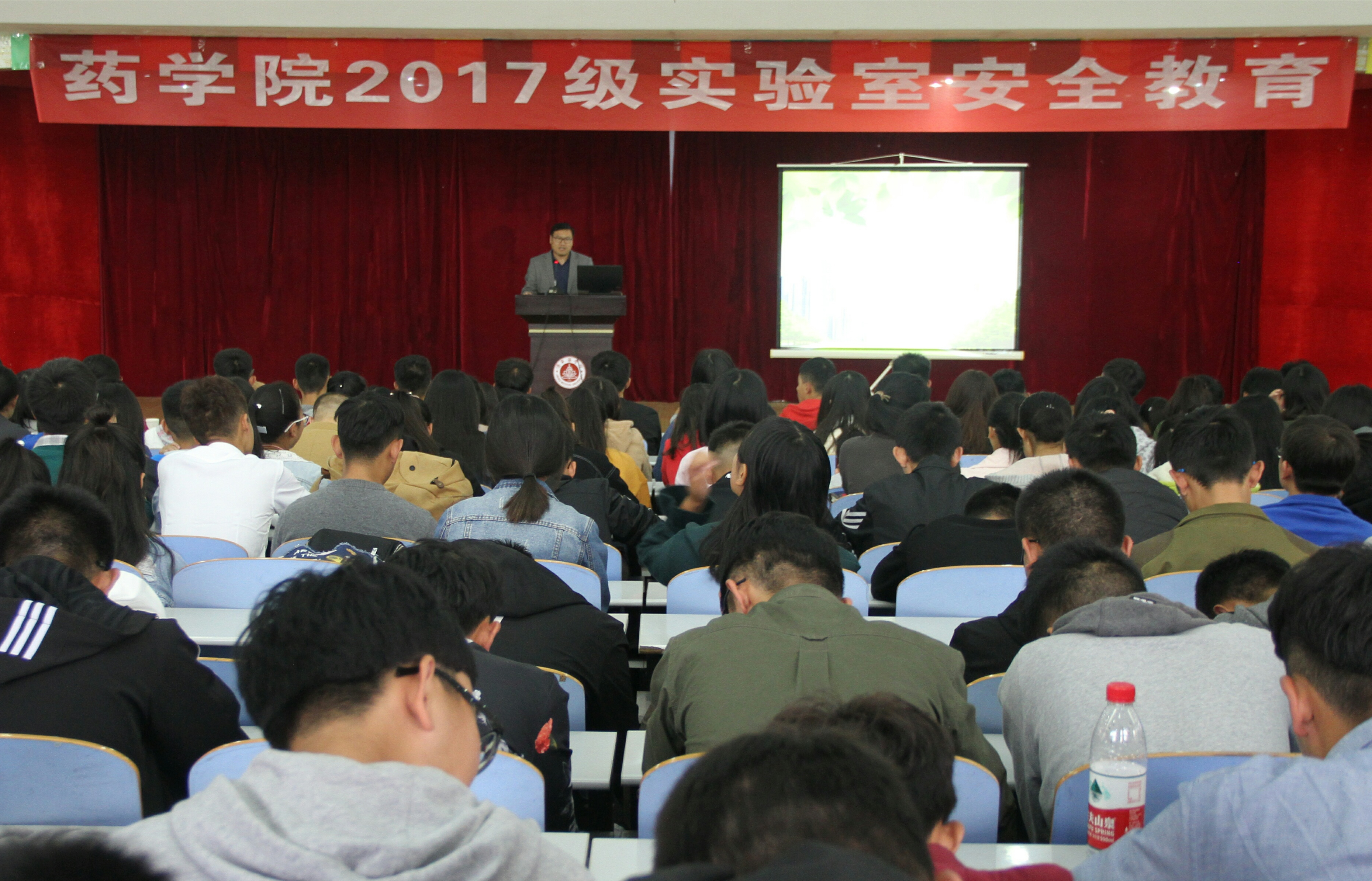 2017年10月13日下午,药学院在一楼多功能厅举办了2017级新生实验室安全教育。此次活动安排在新生进实验室之前,旨在通过实验室安全知识培训,提高学生的实验室安全意识,确保实验教学安全顺利的开展。药学院副院长王其宝、药学实验中心主任李伟、2017级辅导员、班主任和2017级全体学生参加了本次活动。