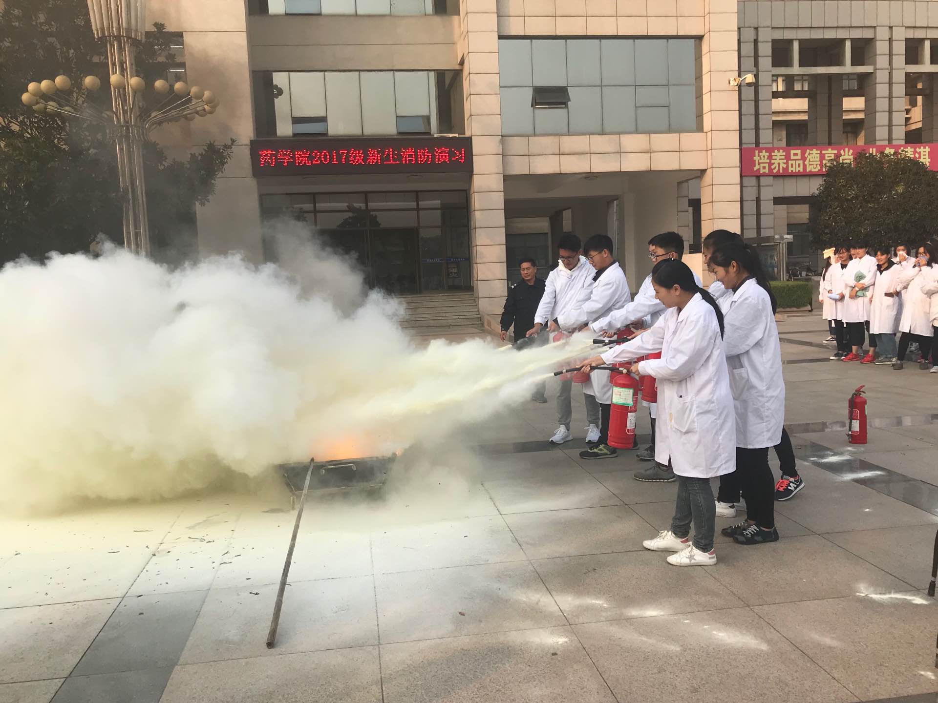本次消防逃生演练紧紧围绕消防安全知识展开,一声哨下,师生反应敏捷、行动迅速,井然有序按照逃生路线迅速地跑出实验楼,在楼前集合完毕,用时不到2分钟。整个演练过程严谨而有序,达到了演练的预期效果。随后,学校保卫科老师为参与此次活动的师生示范讲解了灭火器的正确使用方法,并组织师生进行了现场“灭火”演练,让老师、学生们掌握了灭火器的正确使用方法。