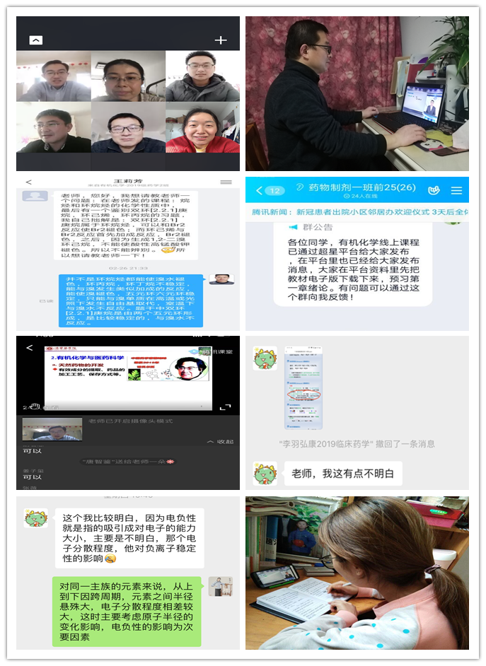 药物化学教研室承担8门线上课程,为了保证线上教学效果,该教研室利用微信群视频进行集体备课;为更好配合超星平台授课:王守信老师采用QQ群与学生互动,孔令栋老师利用腾讯课堂在线直播答疑,丁林老师利用微信课下给学生答疑。