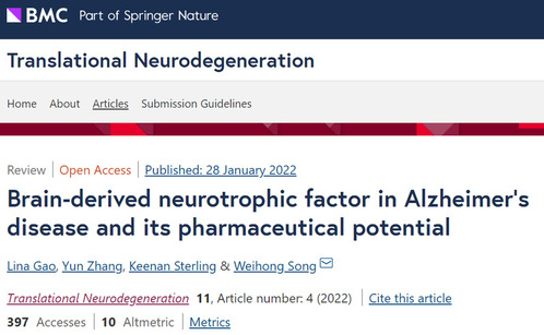 近日,我院高丽娜博士在国际权威期刊《Translational Neurodegeneration》(IF:8.014)在线发表了题为“Brain-derived neurotrophic factor in Alzheimer's disease and its pharmaceutical potential”的综述文章,高丽娜为该论文第一作者,加拿大健康科学院院士、温州医科大学学术副校长宋伟宏院士为本文的通讯作者,济宁医学院为本文的第一通讯单位。